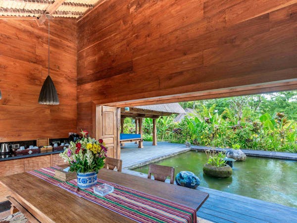Gladak House is a rustic riverside retreat, the very first residence completed on the estate. This self-contained cottage features a fully equipped kitchen and a luxurious indoor–outdoor en-suite bathroom, seamlessly blending comfort with the surrounding tropical forest. Opening directly to natural river-fed pools beside the Ayung River, Gladak House offers a secluded hideaway that captures the essence of Bali’s serene beauty.