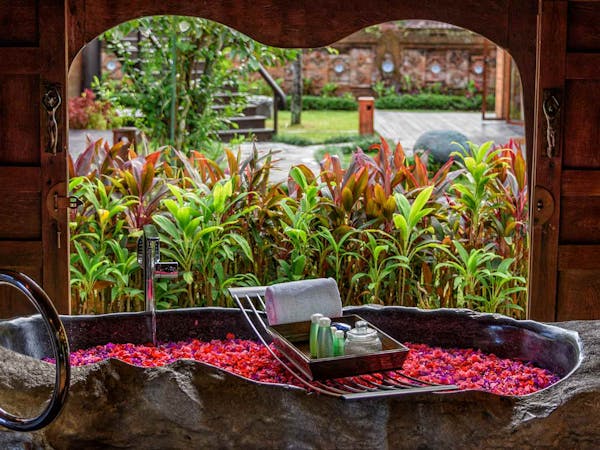 The Blora Suite stands as a tribute to the timeless artistry of Indonesia’s master carvers. At its heart lies a romantic canopy bed, complemented by a refined desk and living area that opens onto a private terrace with sweeping, evocative views. The suite’s en‑suite bathroom—another one‑of‑a‑kind masterpiece—offers a sanctuary of space and indulgence, merging traditional craftsmanship with modern comfort.